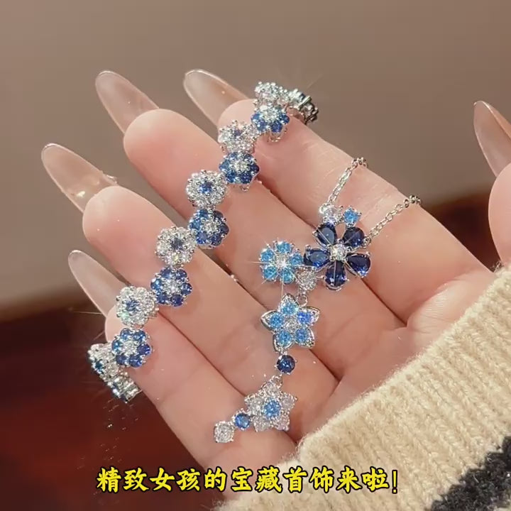 Product Attributes: Material: Copper; Processing Technology: Diamond Setting; Style: Three-piece Set (ear饰品 + neck饰品 + hand饰品, necklace + bracelet); Product Number: Y309, Y638; Place of Origin: Meilong; Chain Style: O-shaped Chain; Pendant Material: Mixed Gemstone Setting; Pattern: Plant Flowers; Color: Red (Ruby Earrings), Red (Ruby Bracelet), Red (Ruby Necklace), Blue Crystal Bracelet, Blue Crystal Necklace; Main Downstream Platforms: Taobao, eBay, Amazon, Wish, Kuaishou, LINIO, SHEIN, AliExpress, Tmall, Independent Website, Shopee, Douyin, Others; Has Authorized Own Brand: No; Is Cross-border Export Dedicated Source: Yes; Listing Year/Season: Spring 2025; Style: Sweet; Trending Elements: Rose, Camellia; Style Classification: Fresh and Sweet; Main Sales Regions: Others; Target Users: Female; Trending Element Classification: Plant Flowers