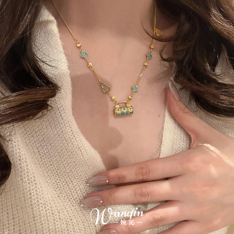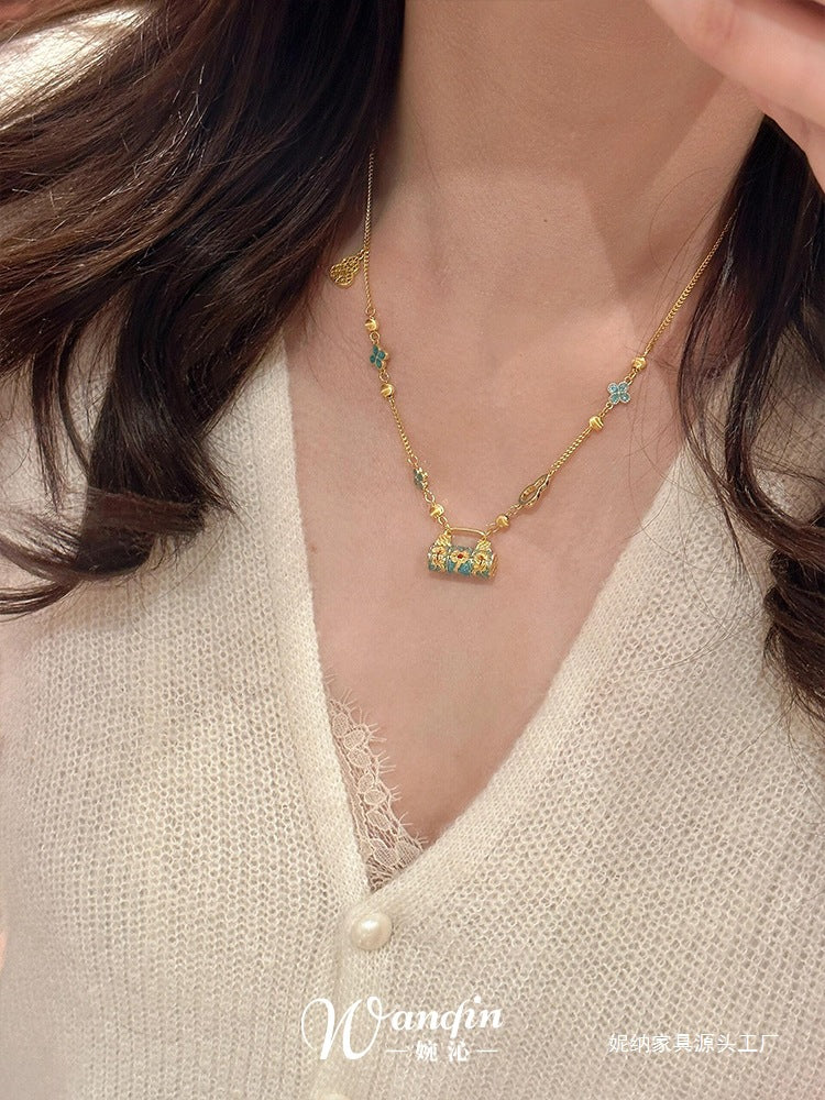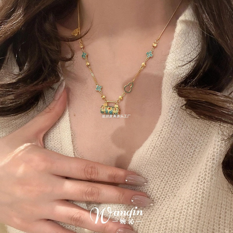 New Chinese style enamel fired blue safety lock pendant necklace